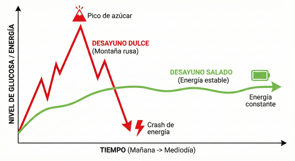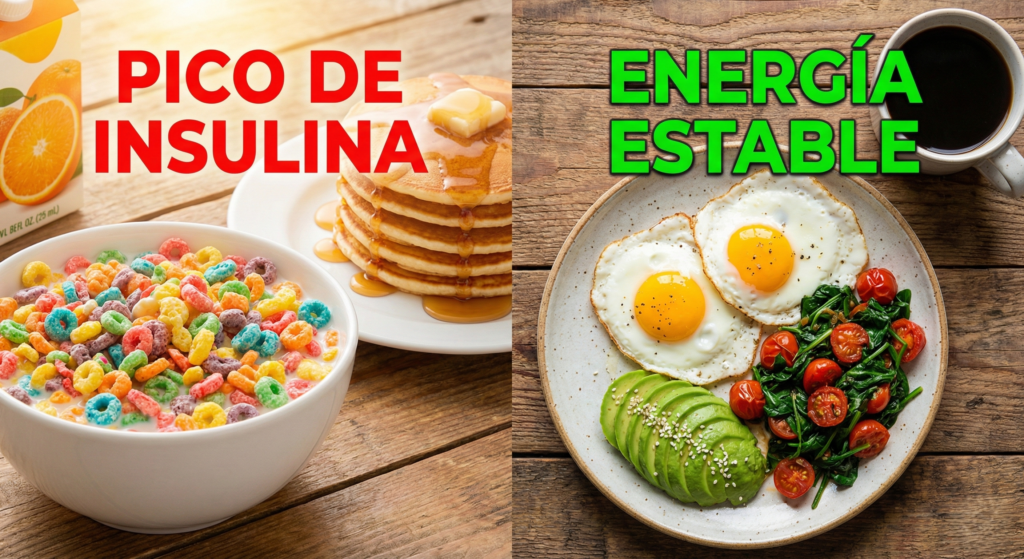 Cuando comes carbohidratos solos (pan, fruta, cereales) a primera hora con el estómago vacío, tu glucosa en sangre se dispara. Tu cuerpo entra en pánico y libera mucha insulina para bajarla.