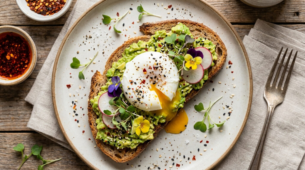 La Tostada «Anti-Picos»: Pan integral real + medio aguacate machacado + 1 huevo (o queso cottage) + un chorrito de aceite de oliva.